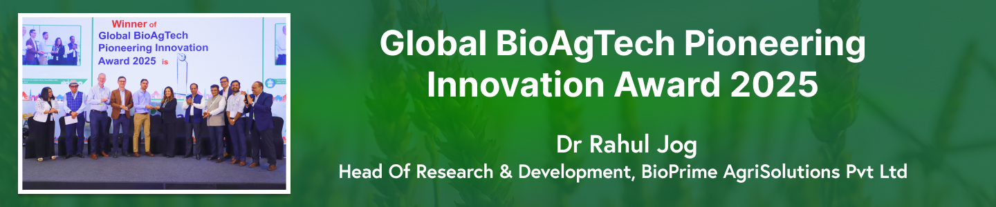 Dr. Rahul Jog, Head of Research and Development at BioPrime AgriSolutions Pvt. Ltd., was awarded the esteemed Global BioAgTech Pioneering Innovation Award 2025, presented by OCP NutribioTek. The award honors breakthrough innovation in biological agriculture that creates transformative value for farmers, ecosystems, and the broader agri-business community.